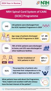 The Spinal Cord System of Care Programme at the NRH provides comprehensive inpatient and outpatient services to patients who, as a result of an accident, illness or injury, have acquired a spinal cord injury, or spinal cord dysfunction, and who require specialist medical rehabilitation.